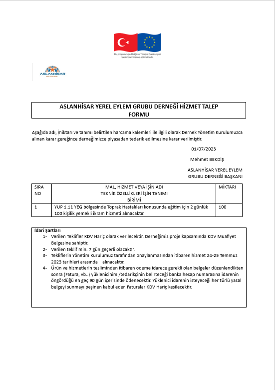 YEG bölgesinde Toprak Hastalıkları konusunda eğitim için 2 günlük 100 kişilik yemekli ikram hizmeti alınacaktır.