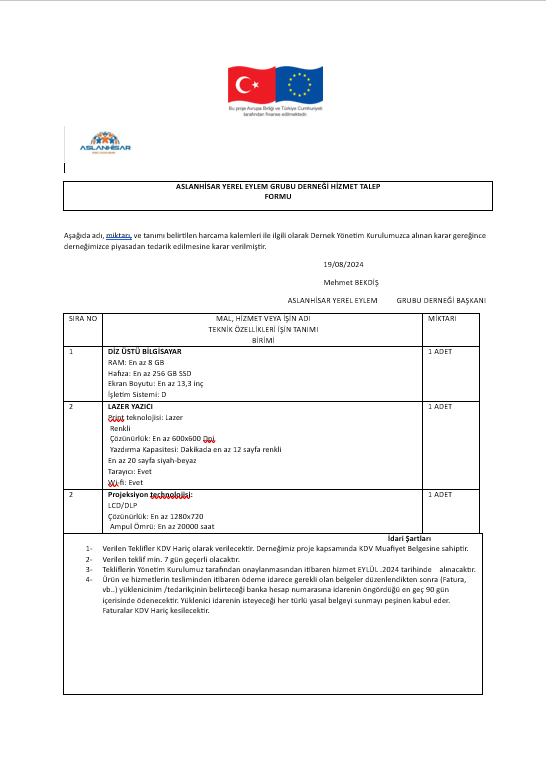 Bilgisayar, Yazıcı, Projeksiyon Cihazı Alımı Yapılacaktır.