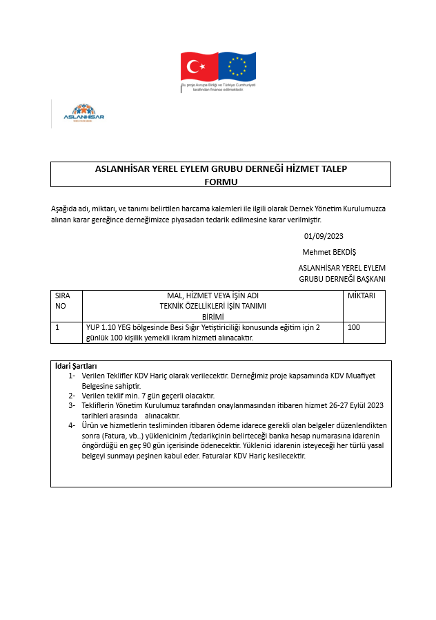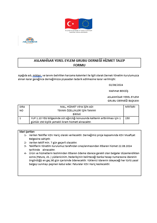 YEG bölgesinde süt sığırcılığı konusunda kalitenin arttırılması için 1 günlük 150 kişilik yemekli ikram hizmeti alınacaktır.