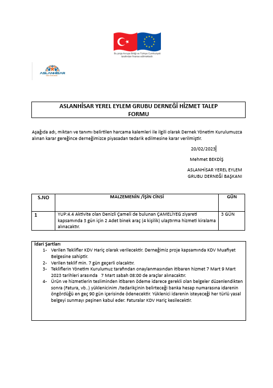 Denizli Çameli de bulunan ÇAMELİYEG ziyareti kapsamında 3 gün için 2 Adet binek araç (4 kişilik) ulaştırma hizmeti kiralama alınacaktır.