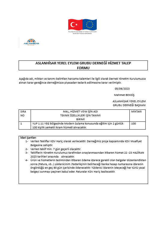 YEG bölgesinde Tarımsal Sulama konusunda kalitenin arttırılması için 1 günlük 150 kişilik yemekli ikram hizmeti alınacaktır.