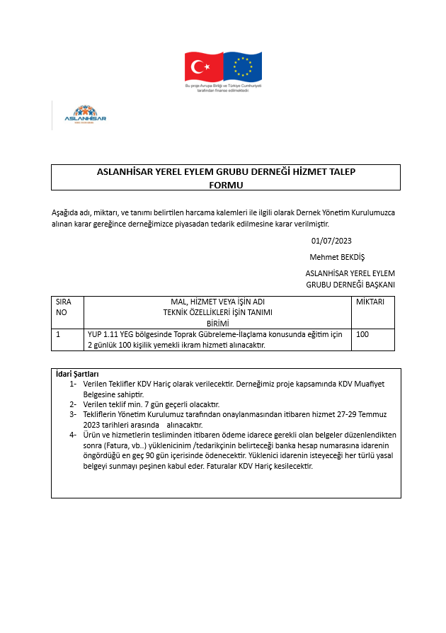 YEG bölgesinde Toprak Gübreleme-İlaçlama konusunda eğitim için 2 günlük 100 kişilik yemekli ikram hizmeti alınacaktır.